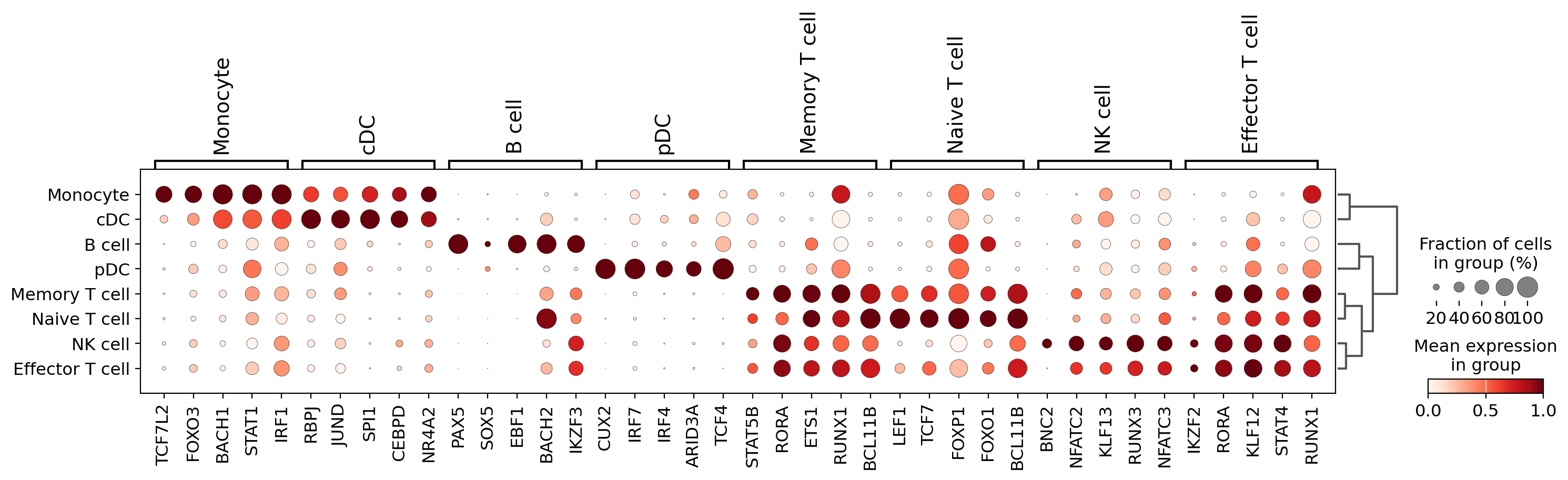 Create a dotplot showing actual transcription factor gene expression across PBMC cell types: